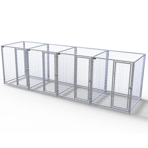 Actual dimensions are 234.25″W x 60″L x 72″H. A complete single row of 4 free standing 5’W x 5’L x 6’H kennels complete with all the stainless steel door handles, all the stainless steel bolt assemblies and plastic leg inserts.
